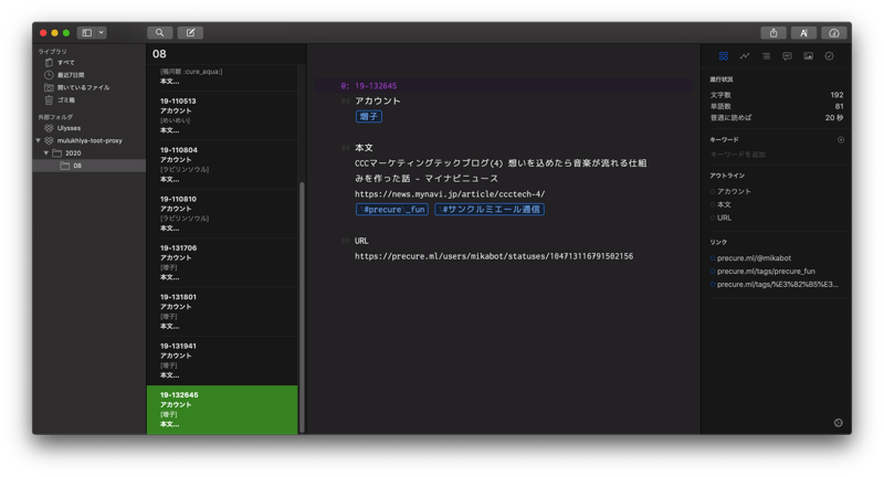 - 例えばiOSやmacOSには、Dropboxに対応したMarkdownエディタUlyssesがあり、Markdownファイルの管理を行うことができます。
